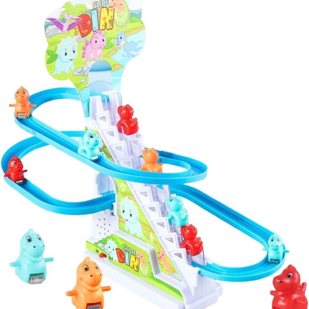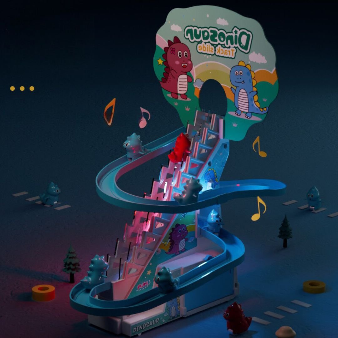 El juego de juguetes viene con luces LED intermitentes y es fácil de montar. Las figuritas pueden subir escaleras y deslizarse por las pistas. El juguete contiene pistas interesantes y música alegre (con botón de encendido / apagado).